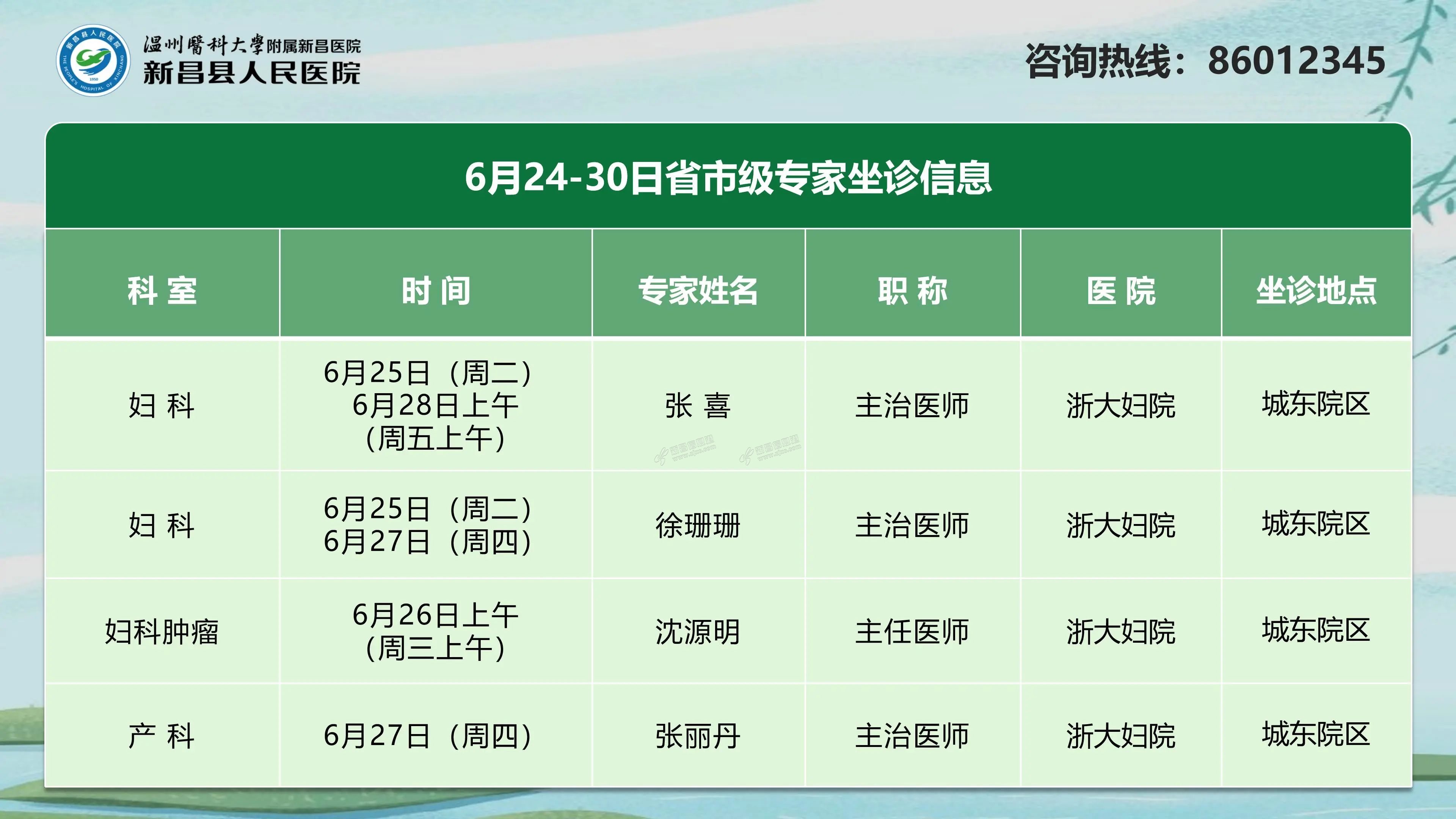 省市级专家坐诊信息 产 科张丽丹主治医师←点击图片查看详情 预约挂号方式电话预约:提前两天拨打0575-86012345 来源:新昌县人民医院
