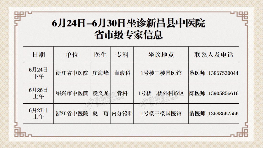 温 馨 提 示 新昌县中医院连贯医疗服务中心预约电话0575-86502366 门诊时间:上午08:00——11:30 下午13:30——17:00 急诊内、外科及发热门诊24小时开放。 来源:新昌县中医院 ...