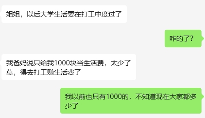 我是07年上大学,那会生活费是1000,在杭州,我们家条件没有很好,一般的一般,不过我妈没让我吃苦,都过了17你年了,现在应该要2000了吧 |