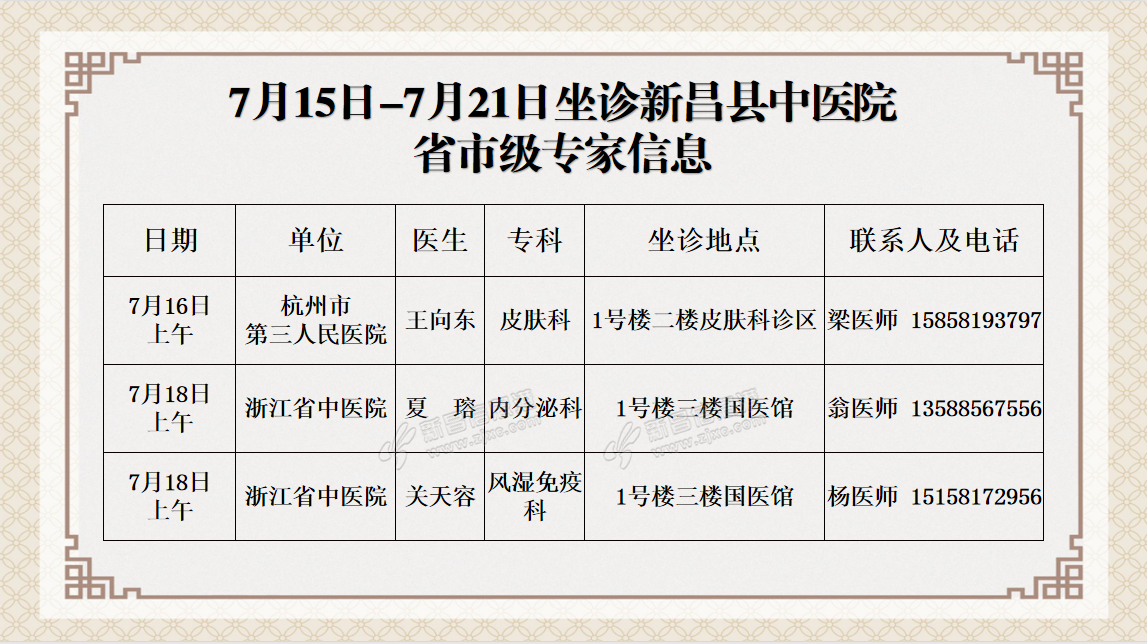 温 馨 提 示 新昌县中医院连贯医疗服务中心预约电话0575-86502366 门诊时间:上午08:00——11:30 下午13:30——17:00 急诊内、外、儿科及发热门诊24小时开放。 来源:新昌县中 ...
