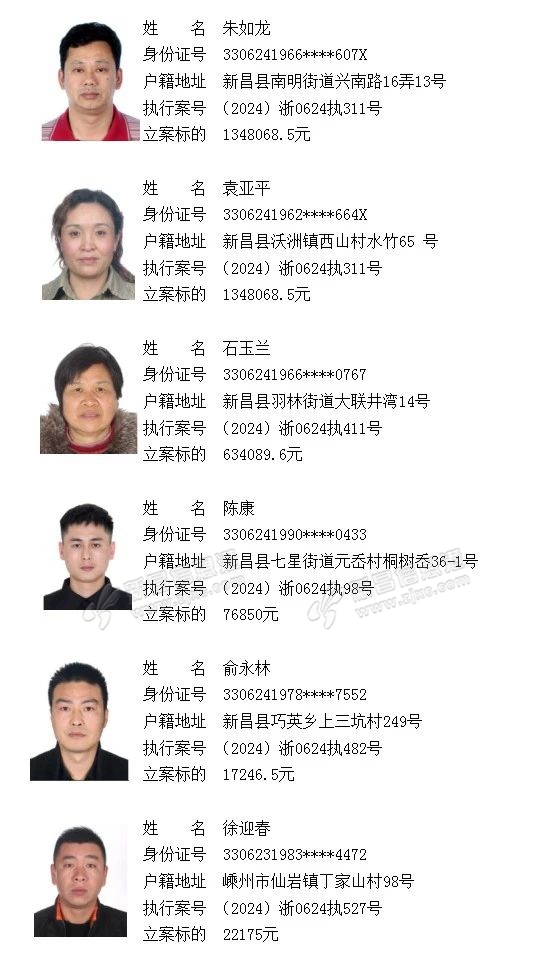 新昌县人民法院曝光公告 为维护法律尊严,依法保护当事人的合法权益,根据相关法律和司法解释的规定,现本院公开曝光以下未自觉履行生效法律文书所确定义务的被执行人,并接受广大群众监督与举报。联系电话:0575-8 ...