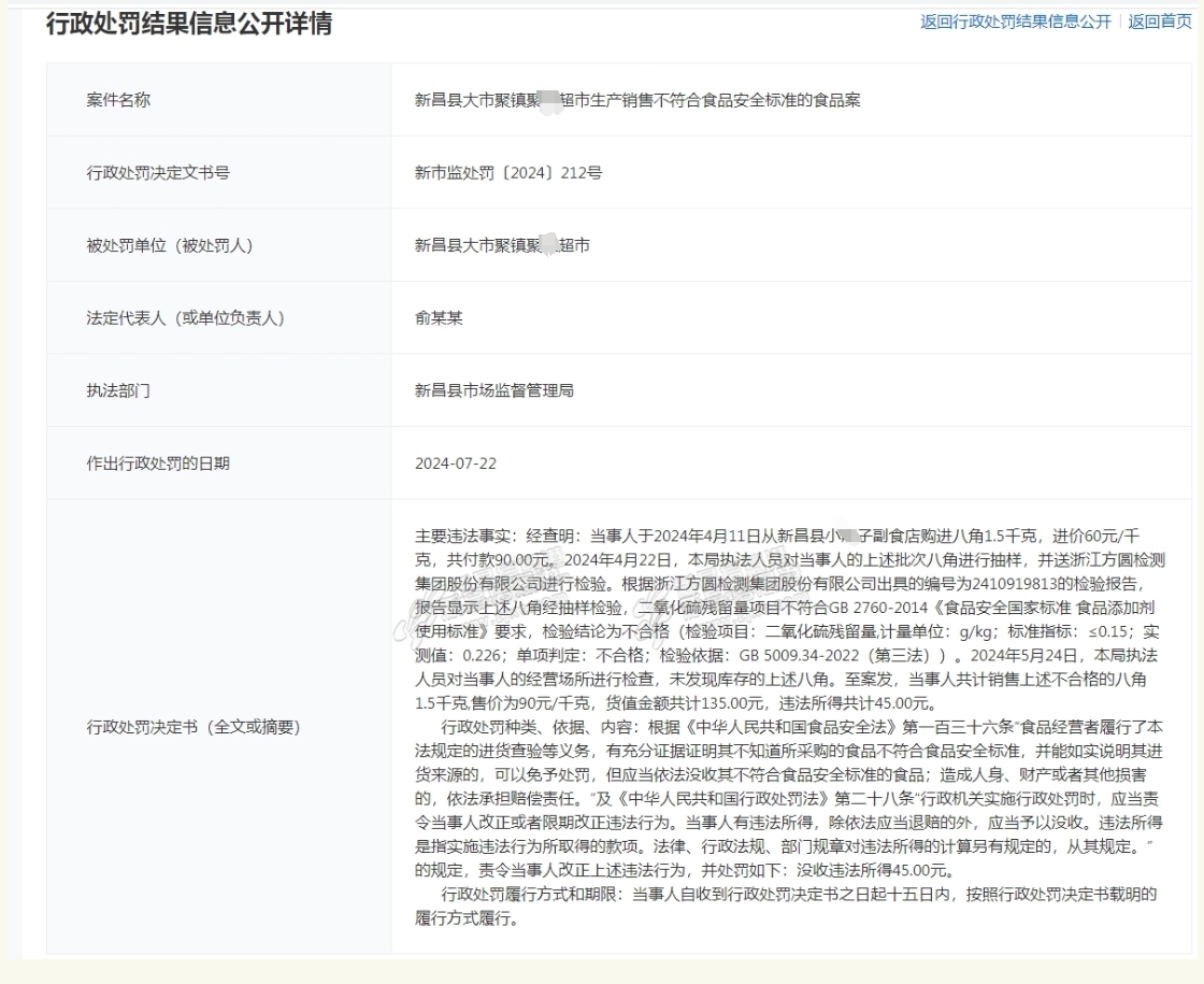 行政处罚决定书(全文或摘要)主要违法事实: 经查明:当事人于2024年4月11日从新昌县小*子副食店购进八角1.5千克,进价60元/千克,共付款90.00元。2024年4月22日,本局执法人员对当事人的上述批次八角进 ...