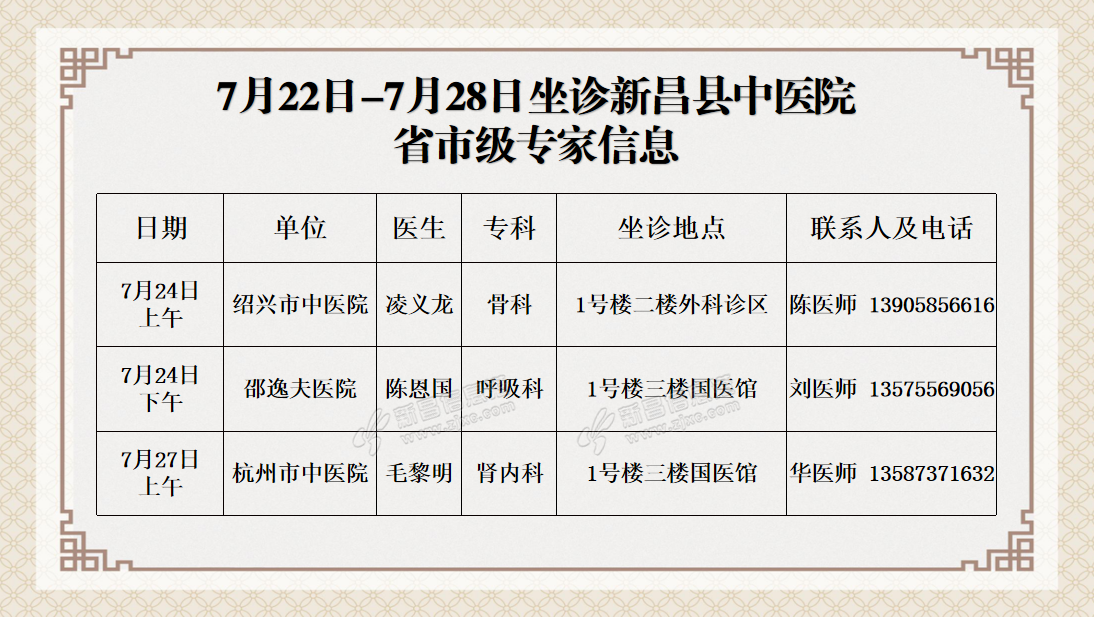 温 馨 提 示 新昌县中医院连贯医疗服务中心预约电话0575-86502366 门诊时间:上午08:00——11:30 下午13:30——17:00 急诊内、外、儿科及发热门诊24小时开放。 来源:新昌县中 ...