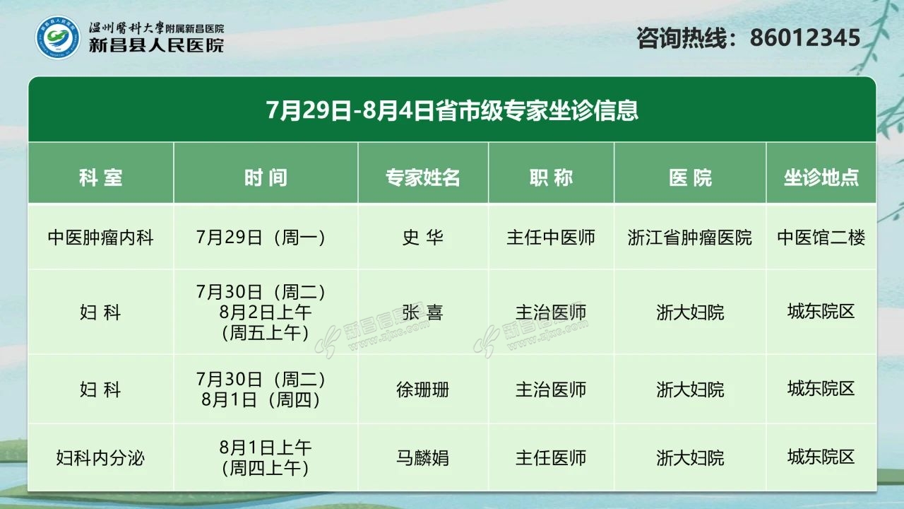 省市级专家坐诊信息 来源:新昌人医