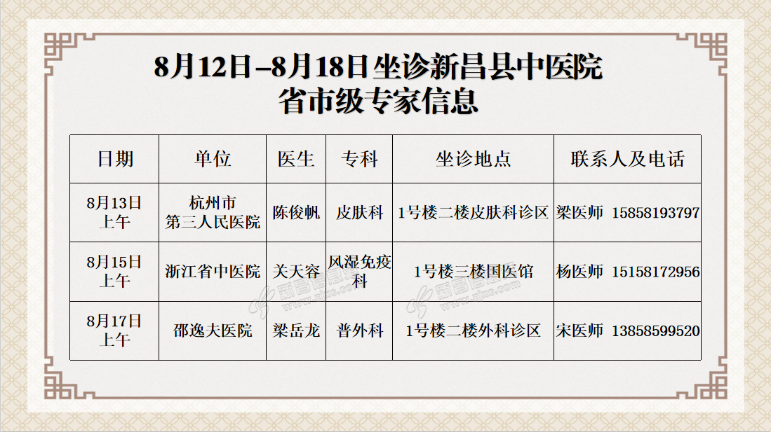 温 馨 提 示 新昌县中医院连贯医疗服务中心预约电话0575-86502366 门诊时间:上午08:00——11:30 下午13:30——17:00 急诊内、外、儿科及发热门诊24小时开放。 来源:新昌县 ...