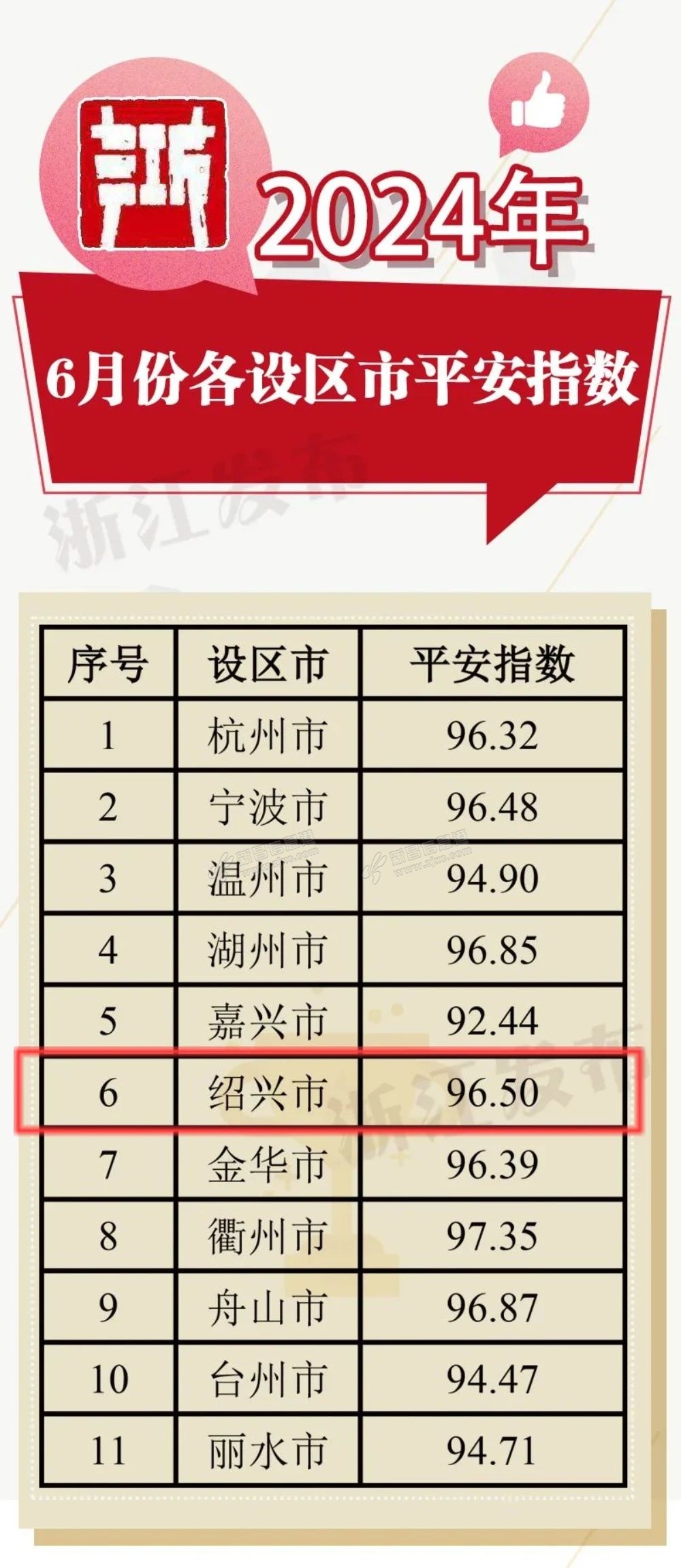 浙江是全国第一个省级公开发布平安指数的省份,平安浙江指数涵盖了市域与县域两个层面,包含对11个设区市的比较,也涵盖了对全省县(市、区)平安状况的评价。2024年6月,绍兴平安指数得分96.50,具体情况如下↓↓ ...