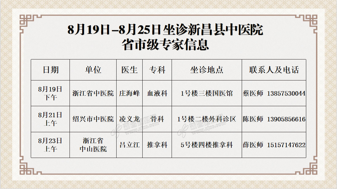温 馨 提 示 新昌县中医院连贯医疗服务中心预约电话0575-86502366 门诊时间:上午08:00——11:30 下午13:30——17:00 急诊内、外、儿科及发热门诊24小时开放。 来源:新昌县中 ...