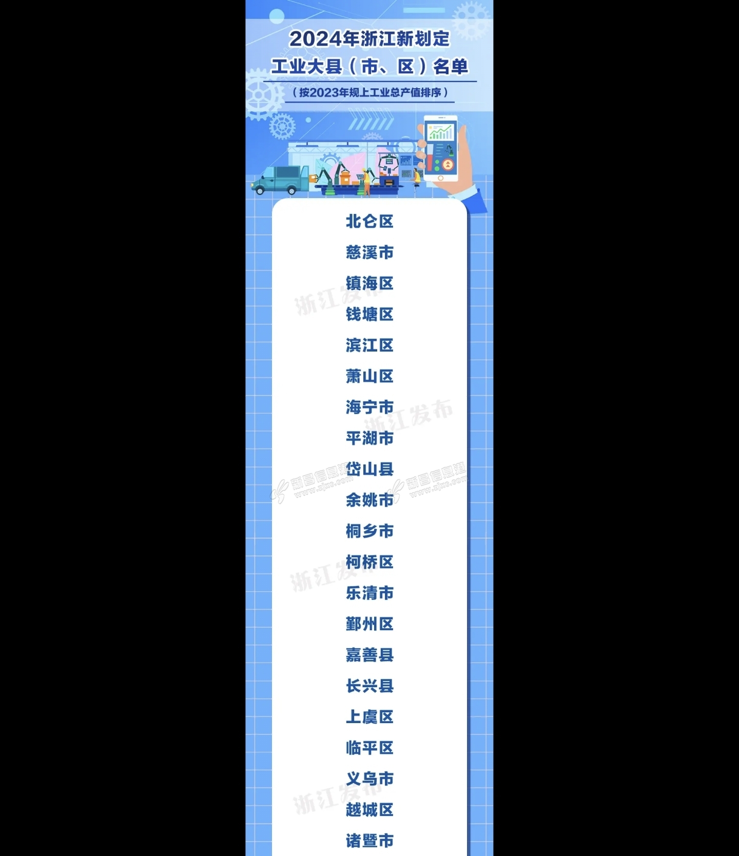 近日,浙江省制造业高质量发展(数字经济发展)领导小组办公室印发《关于进一步发挥工业大县(市、区)勇挑大梁作用的通知》,并公布了新划定的工业大县(市、区)名单,北仑区等45个县(市、区)上榜。浙江工业大县 ...