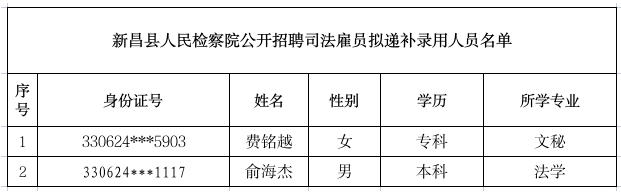 新昌县人民检察院司法雇员拟递补录用人员名单公示 本院近期因司法雇员辞职出现岗位缺额,根据《2023年新昌县人民检察院司法雇员招录公告》有关规定和要求,经研究决定从招录储备库人员中按序递补录用2名。经笔试 ...