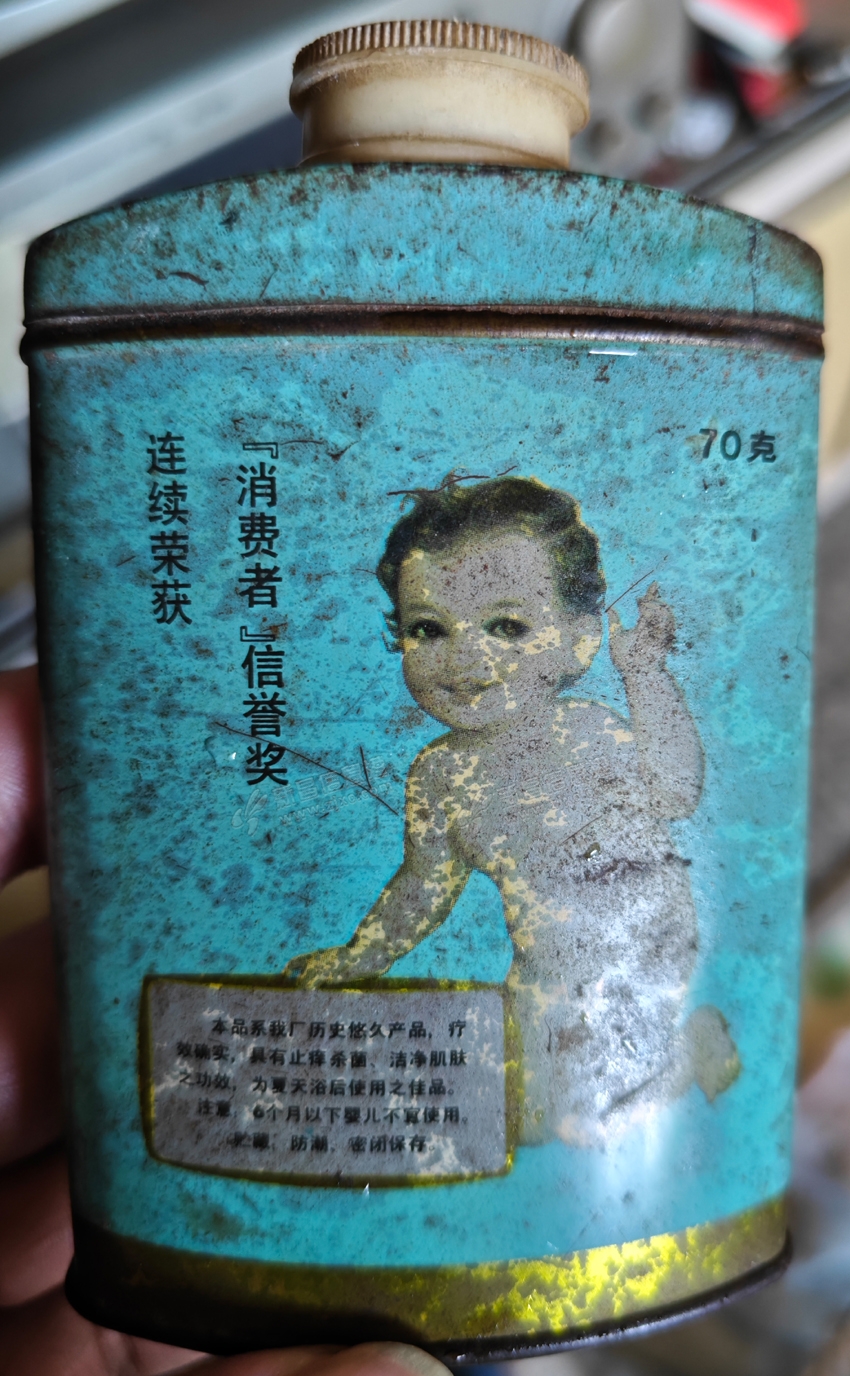 | 痱子粉,以前小孩子必备,夏天热,没空调,现今用的人少了,都在空调房,生痱子的人少了 |