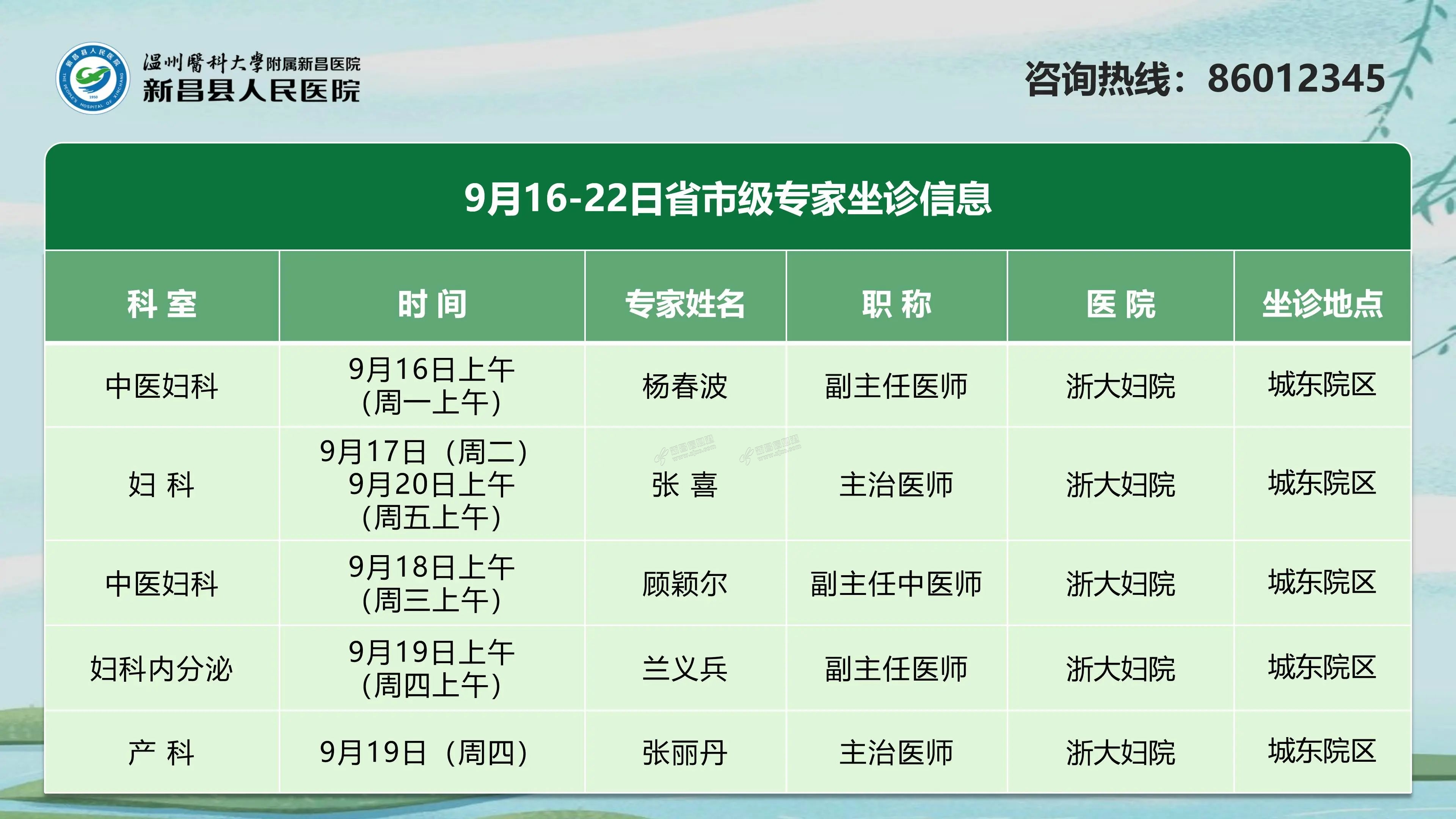 省市级专家坐诊信息 妇 科张 喜主治医师←点击图片查看详情 预约挂号方式 电话预约:提前两天拨打0575-86012345 微信预约:关注“新昌人医”微信公众号 来源:新昌人医