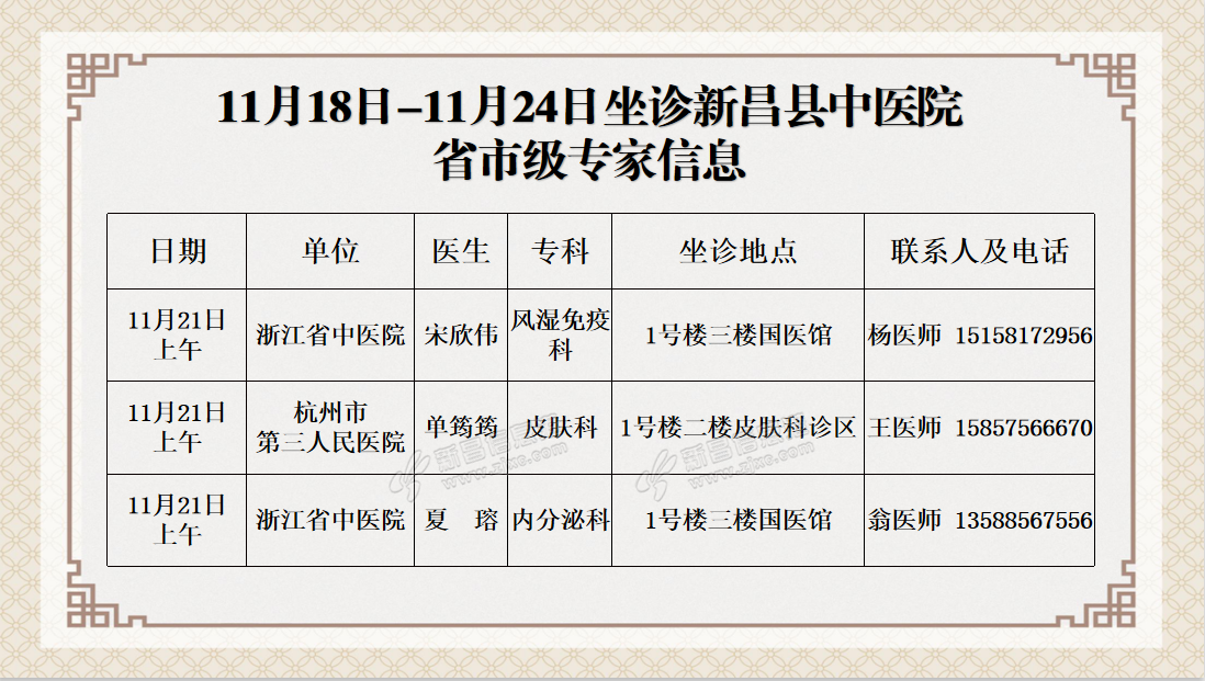 温 馨 提 示 新昌县中医院连贯医疗服务中心预约电话0575-86502366 门诊时间:上午08:00——11:30 下午13:30——17:00 急诊内、外、儿科及发热门诊24小时开放。 邱原刚心血管内科&nbs ...