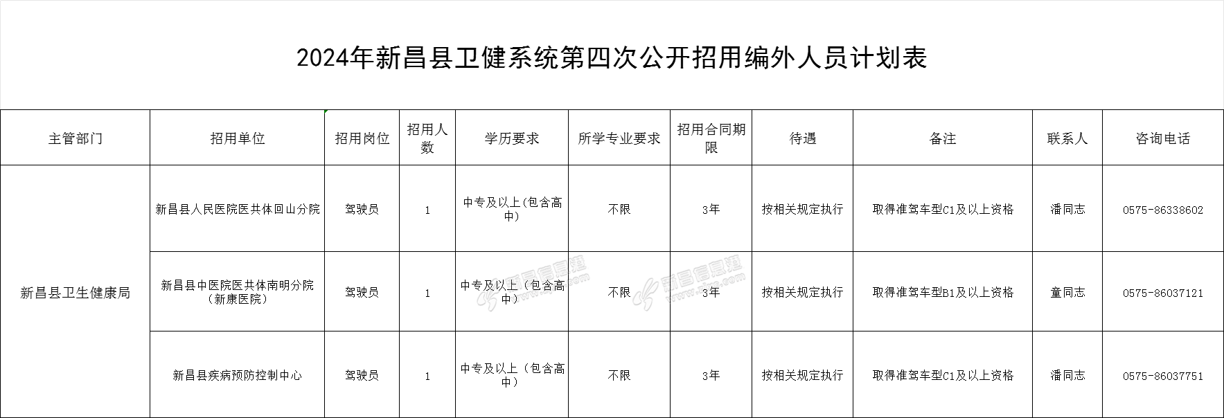 为满足卫健系统事业单位补充编外用工的需要,根据《新昌县机关事业单位编外聘用人员管理办法》(新委办〔2022〕69号)文件精神,县卫健局决定组织开展2024年新昌县卫健系统第四次公开招用编外人员工作。现将有关事项 ...