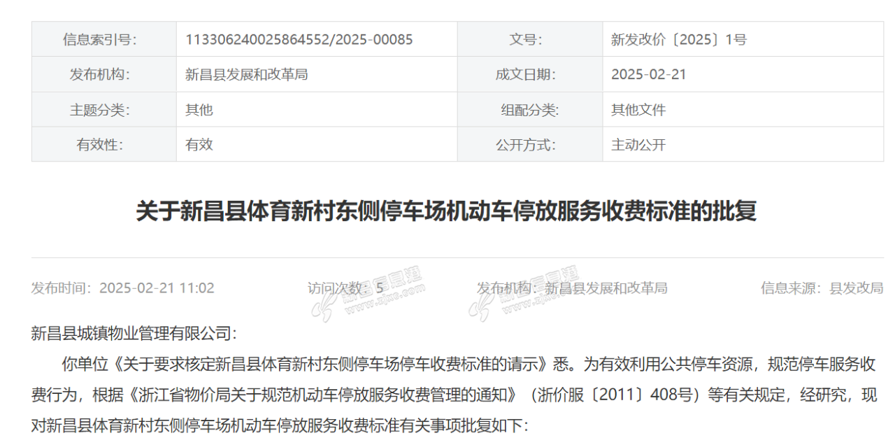 关于新昌县体育新村东侧停车场机动车停放服务收费标准的批复 新昌县城镇物业管理有限公司:你单位《关于要求核定新昌县体育新村东侧停车场停车收费标准的请示》悉。为有效利用公共停车资源,规范停车服务收 ...