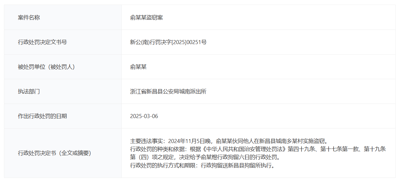 主要违法事实:2024年11月5日晚上,董某某伙同他人在新昌县城南乡某村实施盗窃。 行政处罚的种类和依据:根据《中华人民共和国治安管理处罚法》第四十九条、第十七条第一款、第十九条第(四)项之规定,决 ...
