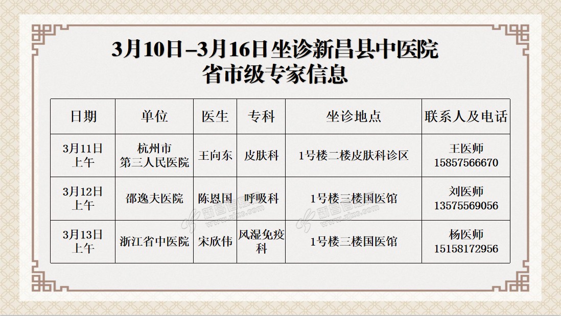 温 馨 提 示 新昌县中医院连贯医疗服务中心预约电话0575-86502366 门诊时间: 上午08:00——11:30 下午13:30——17:00 急诊内、外、儿科及发热门诊24小时开放。 赵礼君 耳鼻咽 ...