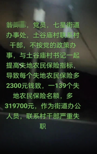 翁**,党员,七星街道办事处,土谷庙村联系村干部,不按党的政策办事,与土谷庙村书记一起提高失地农民保险指标,政策下来0.75亩为一个失地农民保险名额,硬是抬高0.98亩为一个失地农民保险名额,导致每个失地农民保 ...