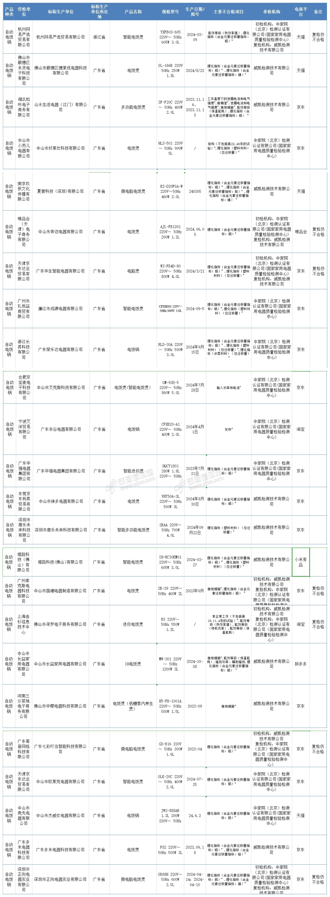 近日,国家市场监督管理总局通报2024年网售产品质量国家监督抽查情况,其中涉及24批次不合格自动电饭锅不合格问题涉及能效等级、合金元素迁移量指标接地措施等 不合格样品具体为: 1.标称杭州网易严选贸易有限 ...
