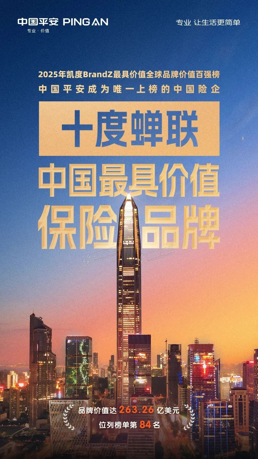 5月15日,2025年凯度BrandZ“最具价值全球品牌价值百强榜”发布,中国平安以超263亿美元的品牌价值跃升至全球保险业品牌价值第一位,品牌价值同比增长25%,位列全球品牌价值百强榜第84位,较去年上升6位。 此外, ...