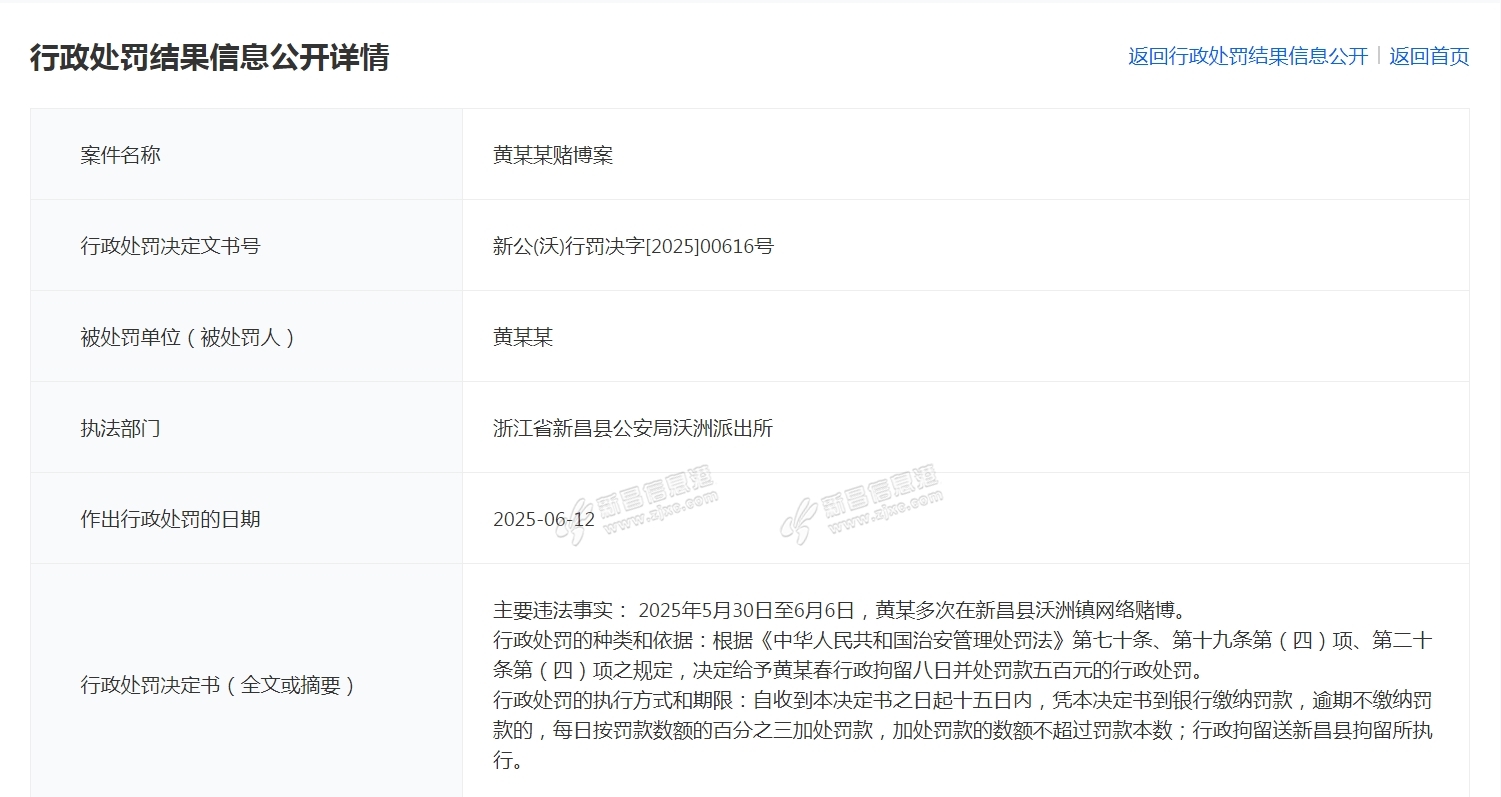 主要违法事实:2025年5月30日至6月6日,黄某多次在新昌县沃洲镇网络赌博。 行政处罚的种类和依据:根据《中华人民共和国治安管理处罚法》第七十条、第十九条第(四)项、第二十条第(四)项之规定,决定给予 ...