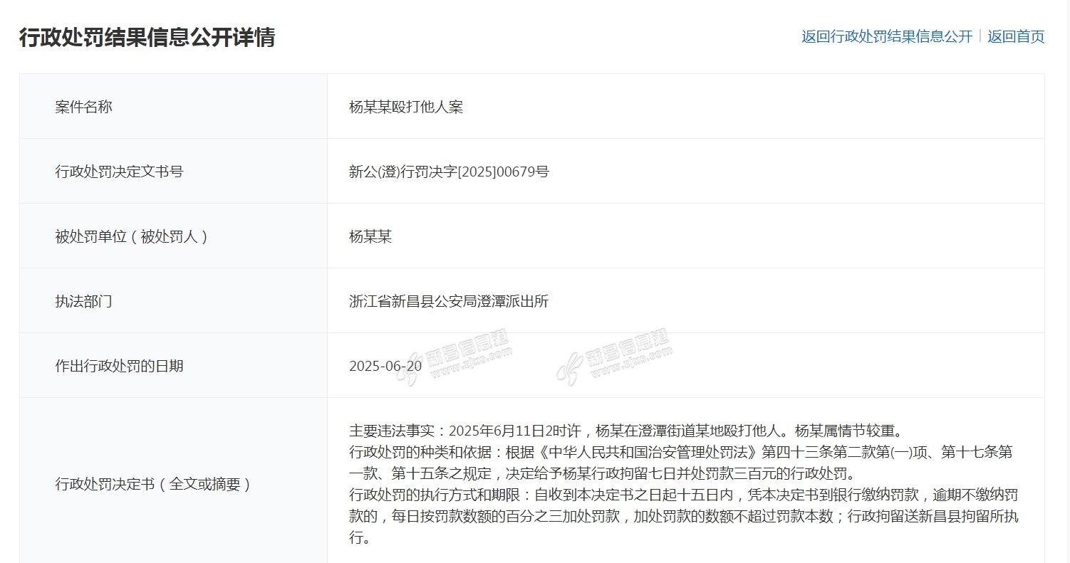 主要违法事实:2025年6月11日2时许,明某某在新昌县澄潭街道某地殴打他人。明某某属情节较重。 行政处罚的种类和依据:根据《中华人民共和国治安管理处罚法》第四十三条第二款第(一)项、第十七条第一款、第 ...
