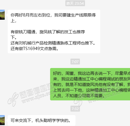 8月份准备去新公司,新公司老板昨晚半夜问我有没有合适的人,公司在发展需要大量人才,最好能来个懂机加现场调试的高手,问我有没有精通旋风铣的人才,跟我来搭手一起干(主要是蜗轮蜗杆这块),我负责技术文件研发 ...