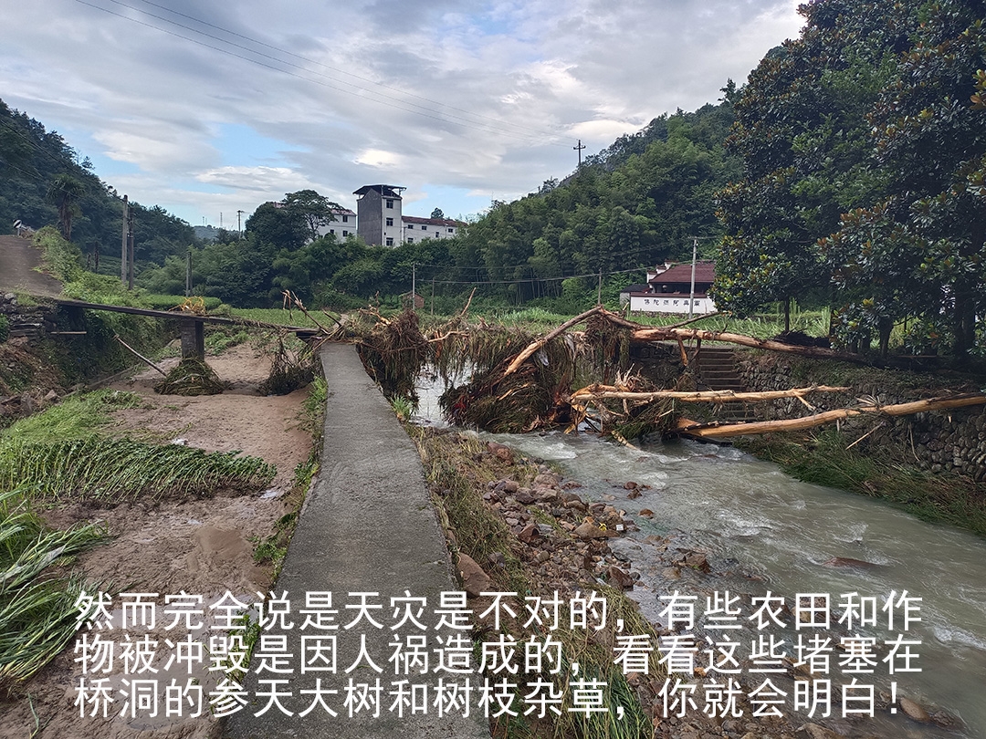桥洞堵塞,下水源变慢,引成积水,慢慢成了洪沟,导致基本农田被毀,茶农的荼叶连根帶土被卷走!若桥洞不堵,下水缓和,水淹基本农田,但肯定冲不走茶树的。 |
