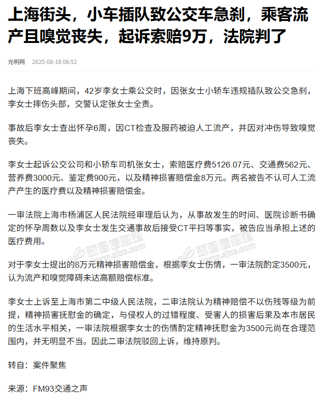 你们怎么看? 上海下班高峰期间,42岁李女士乘公交时,因张女士小轿车违规插队致公交急刹,李女士摔伤头部,交警认定张女士全责。 事故后李女士查出怀孕6周,因CT检查及服药被迫人工流产,并因对冲伤导致嗅觉丧 ...