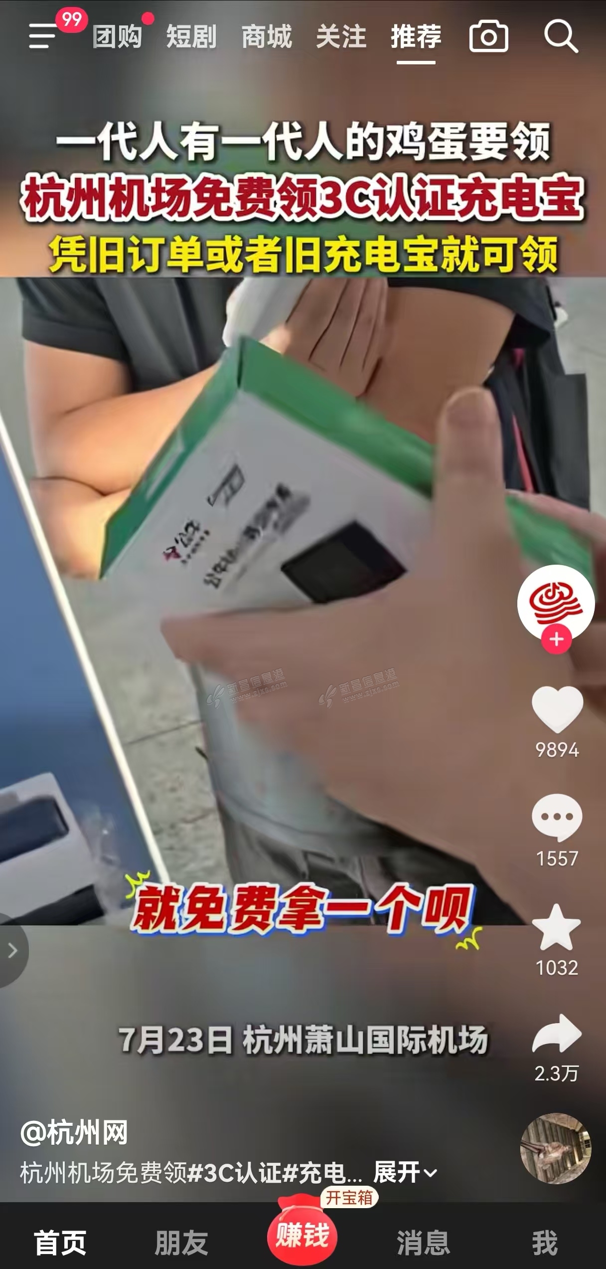 抖音刷到杭州机场在免费送充电宝,新昌有就好了