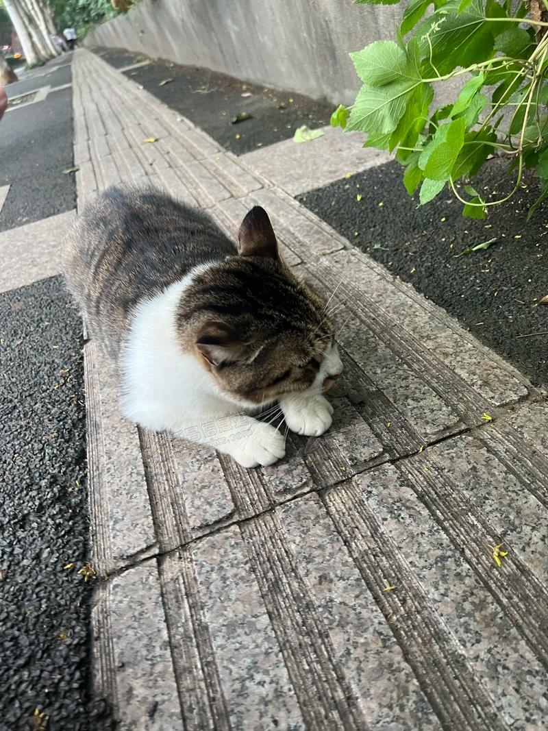 也不怕人,能上手摸,问了扫地阿姨,说是附近的人都在喂他,一直在周边晃荡,到了饭点就会自己回来。