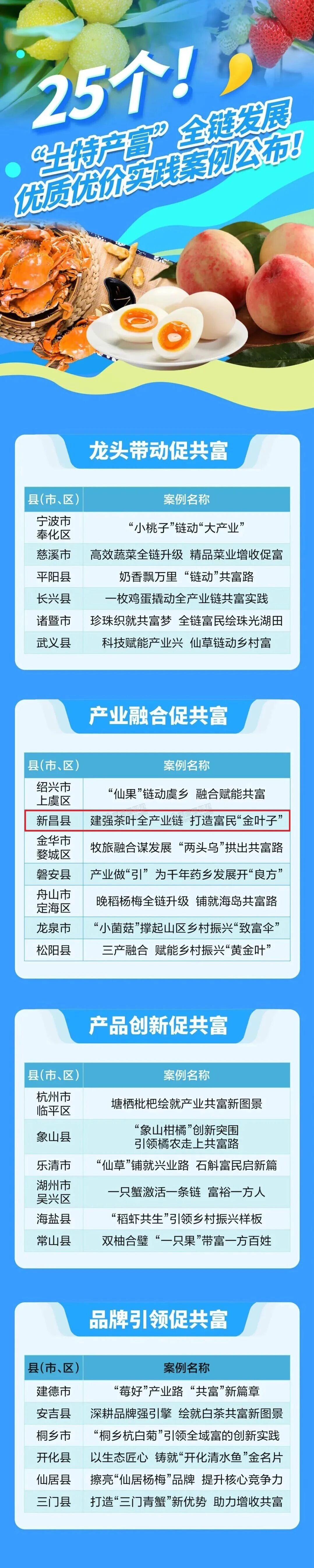 近日,浙江省农业农村厅公布了“土特产富”全链发展优质优价实践案例。我县“建强茶叶全产业链 打造富民‘金叶子’”案例成功入选。 来源:浙江农业农村
