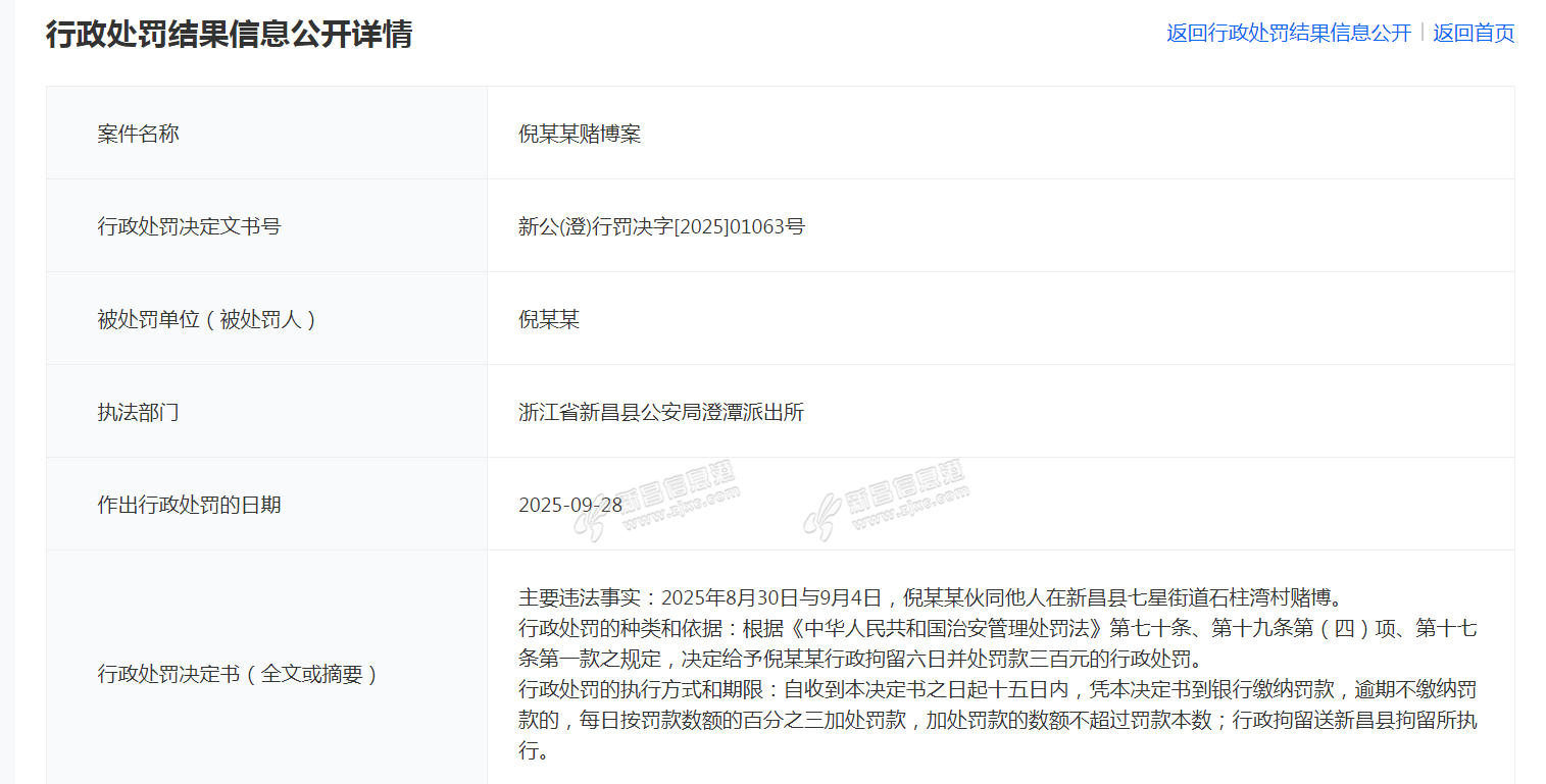 主要违法事实:2025年8月30日与9月4日,周某某伙同他人在新昌县七星街道石柱湾村赌博。 行政处罚的种类和依据:根据《中华人民共和国治安管理处罚法》第七十条、第十九条第(四)项、第十七条第一款之规定 ...