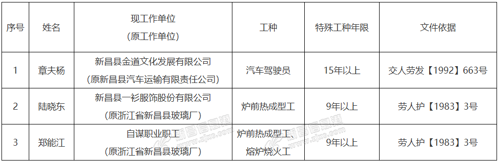 关于特殊工种提前退休人员名单的公示经用人单位/个人申报,我局已受理章夫杨等3人特殊工种提前退休申请,现予以公示,公示期间(10月9日至10月14日)如有异议,请在公示期限内向新昌县人力资源和社会保障局反映,联 ...