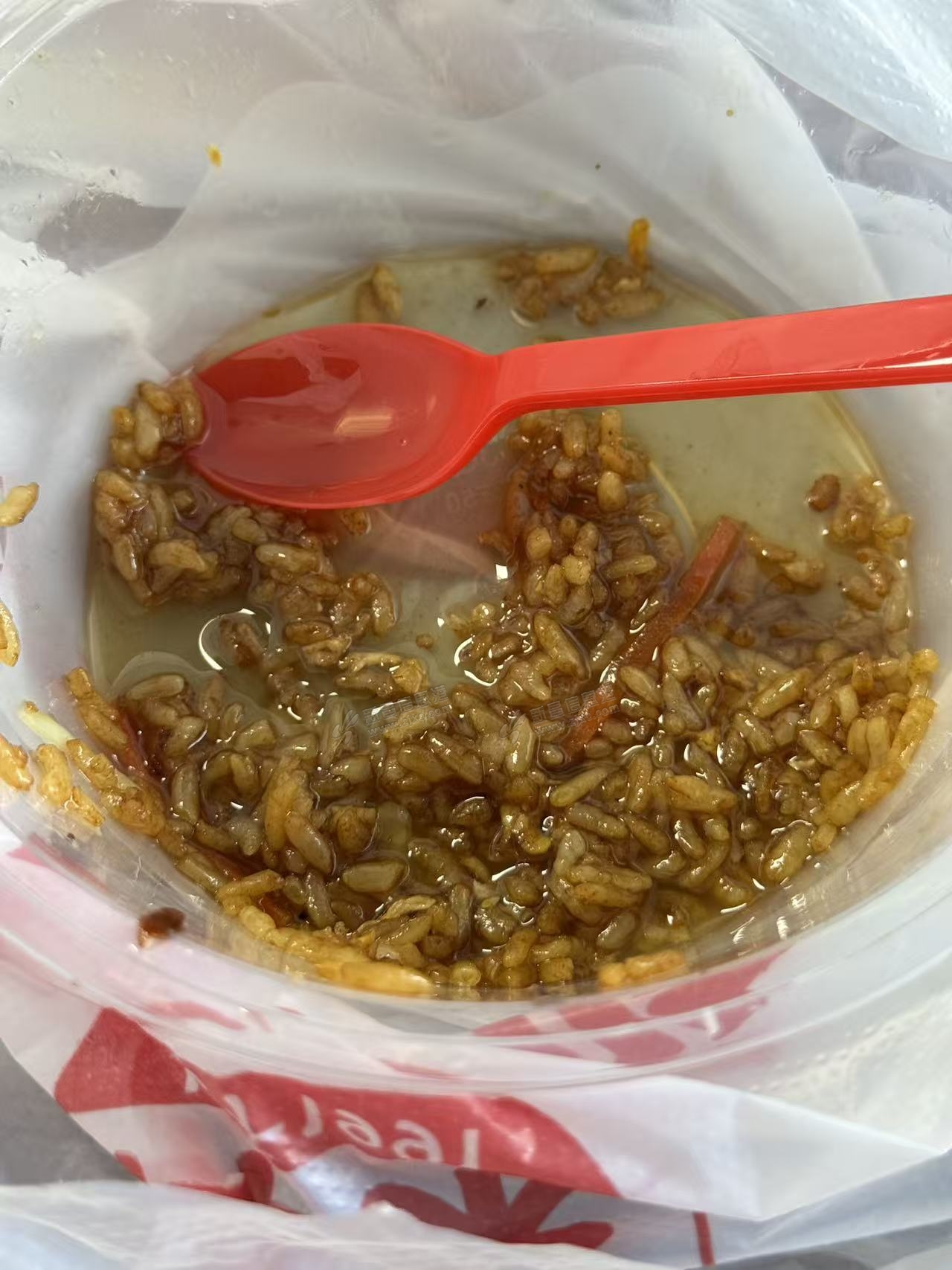 | 这种就是一铁板的油没滤好打进餐盒里了,不太能是地沟油,但确实不好吃 |