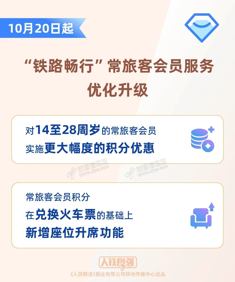 国铁集团优化升级“铁路畅行”常旅客会员服务 10月20日起,中国国家铁路集团有限公司优化升级“铁路畅行”常旅客会员服务,对14至28周岁持居民身份证、港澳台居民居住证、港澳居民来往内地通行证、台湾居民来往大陆 ...