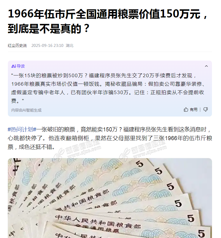 | 这个新闻的题目本就是伪命题:1966年的5斤全国粮票是唯一的一张?那不贵。如果是所有当年发的收齐了更不贵。如果是当年发的某一张或几张,那就是笑话了。吃了饭勿变O的造的新闻了 |