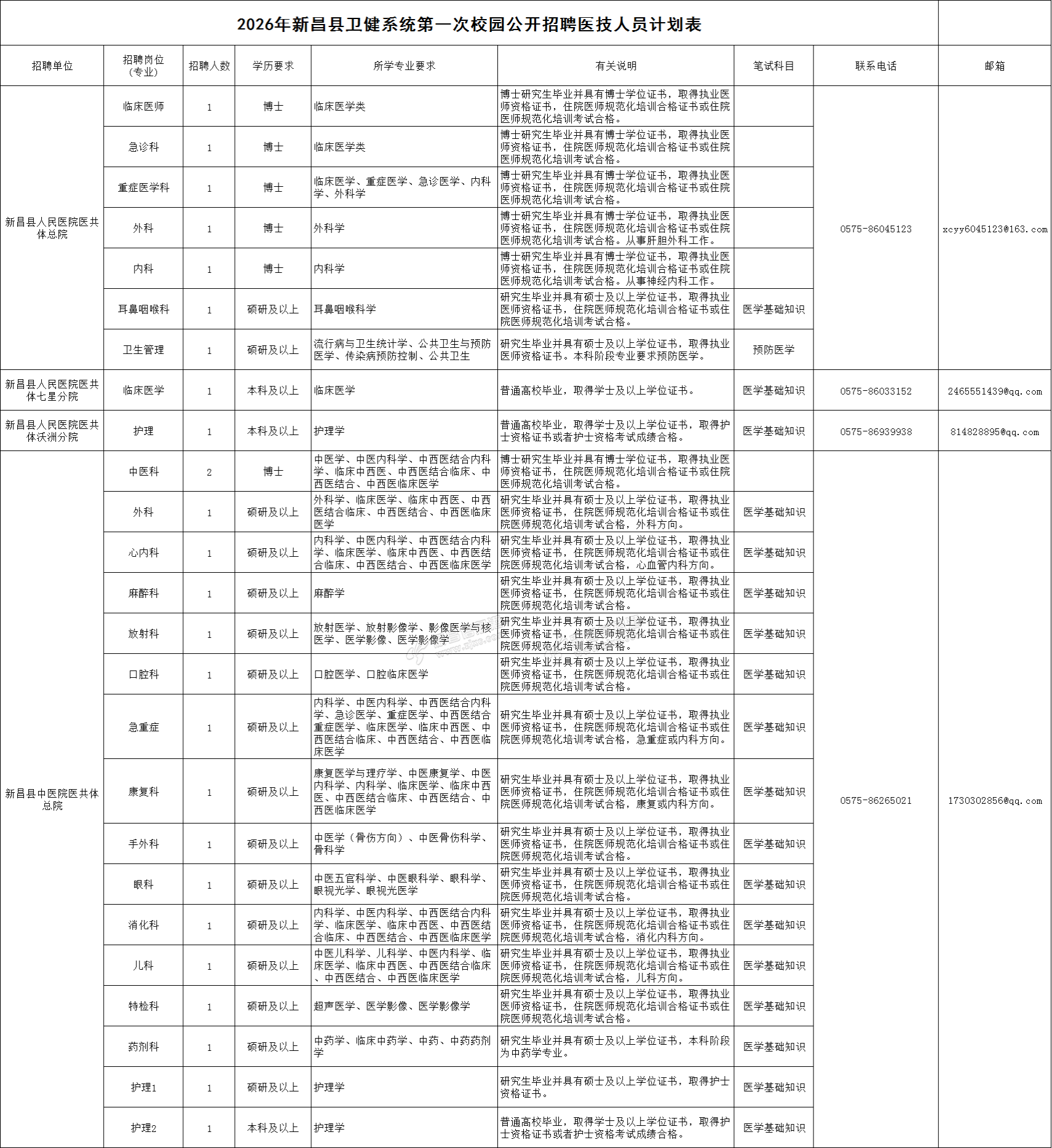 为满足新昌县卫健系统事业单位补充工作人员需要,根据《事业单位人事管理条例》和国家、省市县关于事业单位公开招聘工作的有关文件精神,县卫健局、县人社局经研究决定组织实施2026年新昌县卫健系统第一次校园公开招 ...