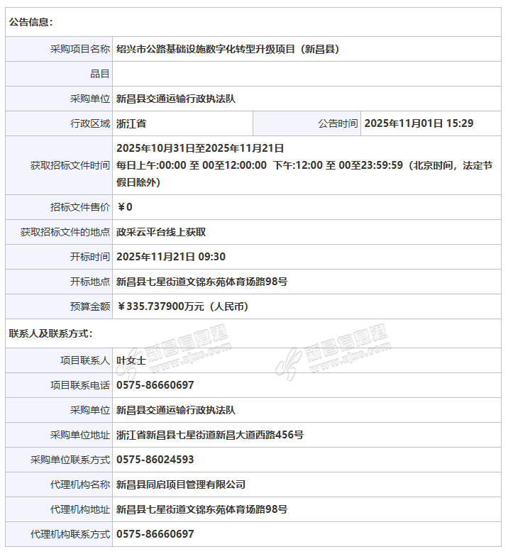 新昌县同启项目管理有限公司关于绍兴市公路基础设施数字化转型升级项目(新昌县)的公开招标公告 项目概况 绍兴市公路基础设施数字化转型升级项目(新昌县)招标项目的潜在 ...