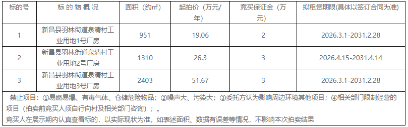 新昌县羽林街道泉清股份经济合作社厂房租赁权拍卖公告 受新昌县羽林街道泉清股份经济合作社的委托,我公司定于2025年11月21日上午9时起至上午11时止(延时除外)在中拍平台对以下标的租赁权进行公开拍卖,现将有关事 ...