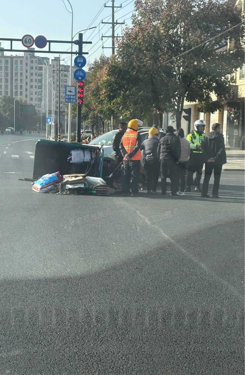 馒头山村口公交车站十字路口车祸,私家车跟三轮车撞翻了,交警已经到了,好多人围观 原标题:馒头山村口公交车站十字路口车祸
