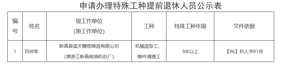 关于特殊工种提前退休审批名单的公示 经单位申报,我局已受理吕仲军特殊工种提前退休申请,现予以公示,公示期间(12月4日至12月10日)如有异议,请在公示期限内向新昌县人力资源和社会保障局反映,联系电话:057 ...