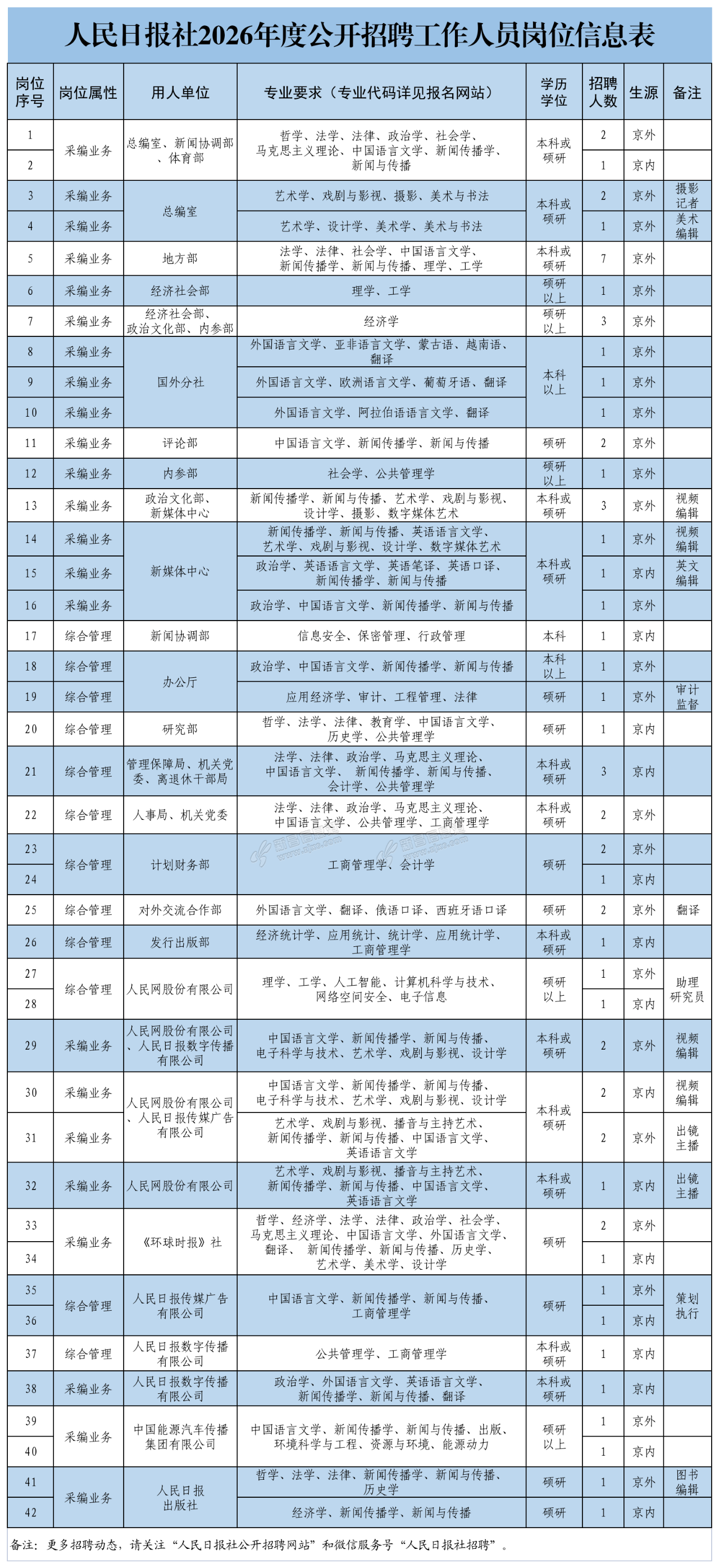 根据事业发展需要,人民日报社2026年度面向国内高校应届毕业生和海外留学人员公开招聘工作人员64名。现将有关事项公告如下。 一、应聘人员基本条件 2.政治立场坚定,拥护中国共产党领导和社会主义制度,深刻领悟“ ...