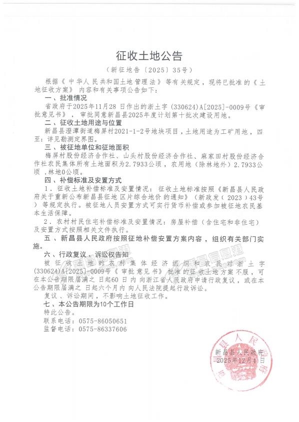 征收土地公告(新昌县澄潭街道梅屏村2021-1-2号地块) 来源:新昌县自然资源和规划局