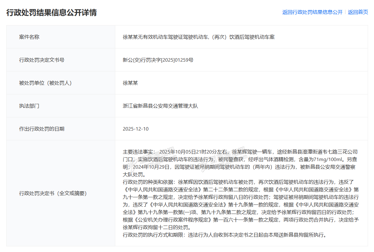行政处罚决定书(全文或摘要)主要违法事实:2025年10月05日21时20分左右,徐某辉驾驶一辆车,途经新昌县澄潭街道韦七路三花公司门口,实施饮酒后驾驶机动车的违法行为,被民警查获,经呼出气体酒精检测,含量 ...
