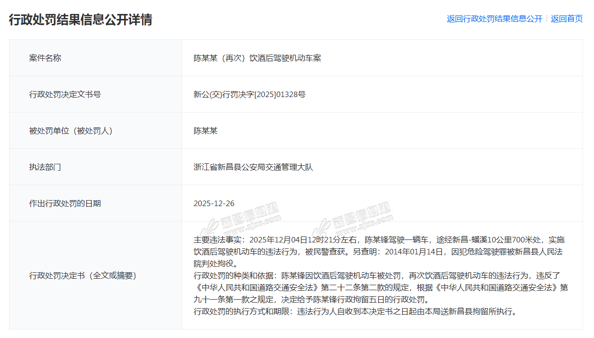 主要违法事实:2025年12月04日12时21分左右,陈某锋驾驶一辆车,途经新昌-蟠溪10公里700米处,实施饮酒后驾驶机动车的违法行为,被民警查获。另查明:2014年01月14日,因犯危险驾驶罪被新昌县人民法院判处拘役 ...