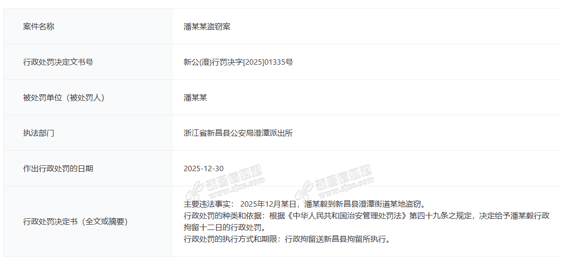 主要违法事实:2025年11月11日,胡某在新昌县某地实施盗窃。行政处罚的种类和依据:根据<<中华人民共和国治安管理处罚法>>第四十九条、第十九条第(二)项、<<公安机关办理行政案件程序规定>>第一 ...