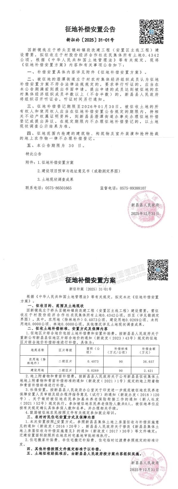 征地补偿安置公告(新镜线左于桥头至镜岭镇段改建工程(安置区主线工程)) 来源:新昌县自然资源和规划局 原标题:征地补偿安置公告
