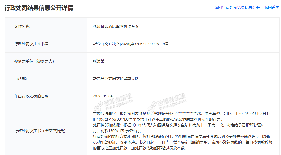 主要违法事实:被处罚对象冯某某,驾驶证号5202************19,准驾车型:C1,于2026年01月02日12时11分驾驶浙D2**R1号小型汽车在铁牛二路路实施饮酒后驾驶机动车的行为。处罚种类和依据:根据<<中华人民共 ...