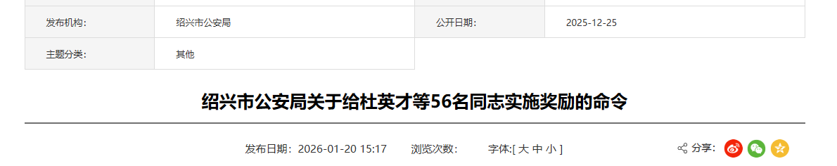 2026年1月20日,绍兴市人民政府网站发布《绍兴市公安局关于给杜英才等56名同志实施奖励的命令》。 原文如下: 各区、县(市)公安(分)局,驻局纪检监察组、市局各部门: 为表彰先进、鼓舞士气, ...