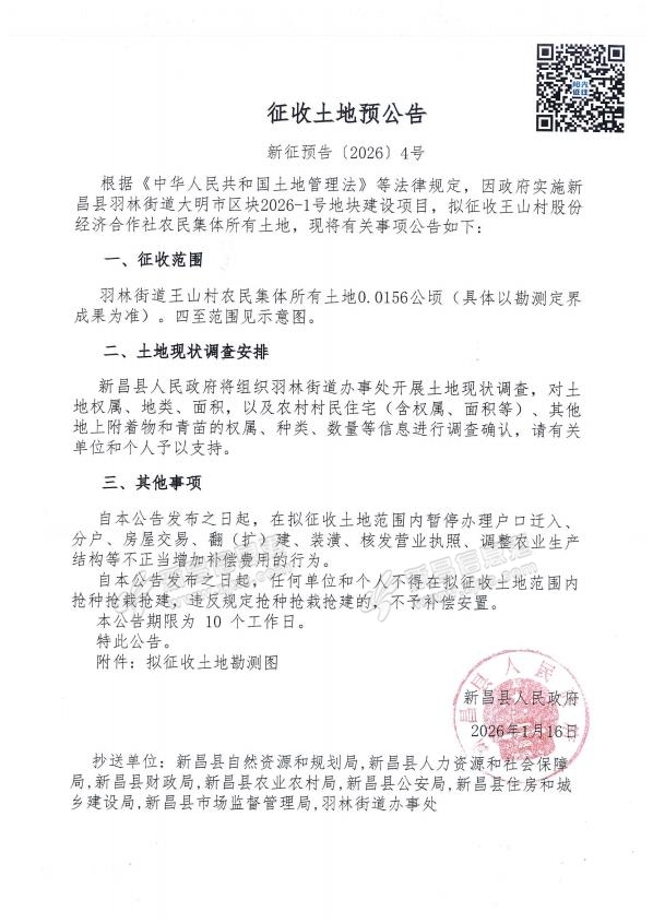 征收土地预公告新昌县羽林街道大明市区块2026-1号地块 来源:新昌县城东自然资源所原标题:征收土地预公告